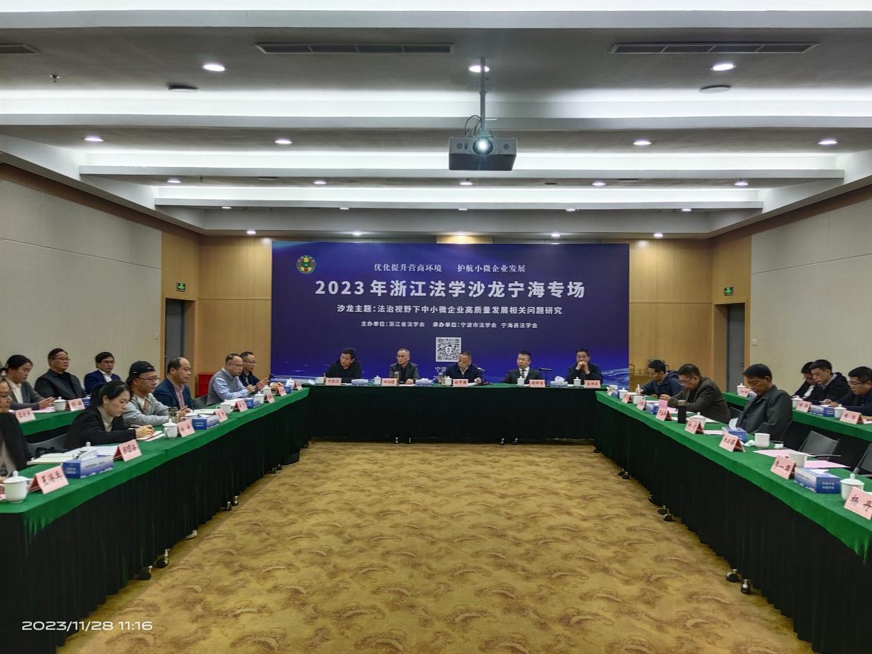 此次法学沙龙由浙江省法学会主办,宁波市法学会、宁海县法学会承办。浙江省法学会首席法律咨询专家代表、浙江财经大学专家学者,宁海县法学会首席法律咨询专家代表,宁海县委政法委、县法院、县检察院、县发改局、县经信局、县科技局、县公安局、县司法局、县人社局、县市场监管局、县工商联等单位分管领导,市人大代表、政协委员,县中小微企业代表、律师代表共37人参加活动。